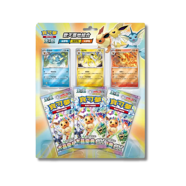 [Traditional Chinese] Eeveelution Terastal Festival ex Pokémon Special Blister - Yellow Set - Vaporeon Jolteon Flareon  This Pokémon Scarlet & Violet Eeveelution Terastal Festival ex Pokémon Special Blister comes in 4 types: Pink Set - Espeon Umbreon Sylveon Green Set - Eevee Leafeon Glaceon Yellow Set - Vaporeon Jolteon Flareon Eeveelution family booklet set Each set features special promo cards and Terastal Festival booster packs. Collect them all and shop the full bundle set to get value deals .  📦 What’s Inside? Condition New & Factory Sealed Language Yellow Set - Vaporeon Jolteon Flareon Promo cards - Vaporeon, Jolteon, Flareon (3 total) Booster Packs - 3x Terastal Festival ex Release Date The release date has been changed to 22 January 2025, instead of 17 January 2025 as originally announced. Shipping 3-5 days after release date